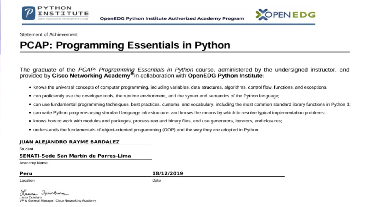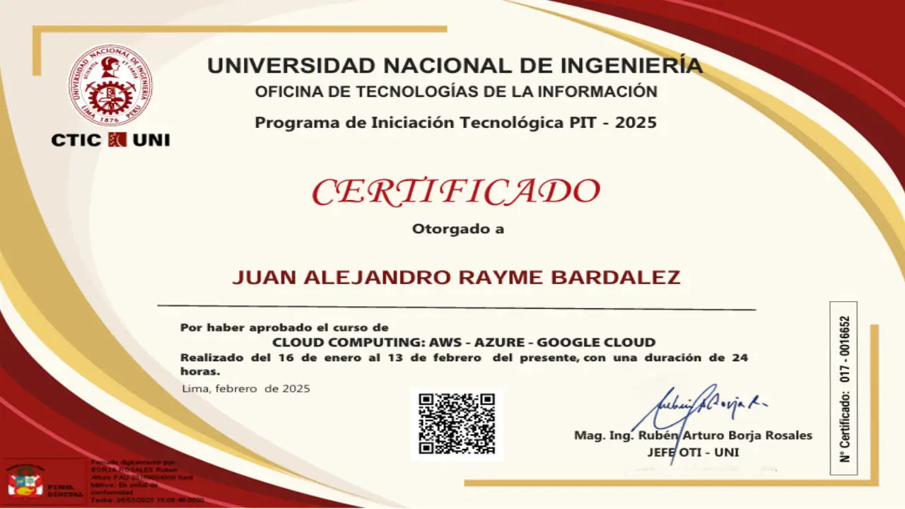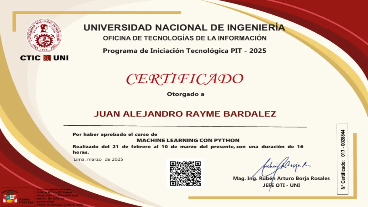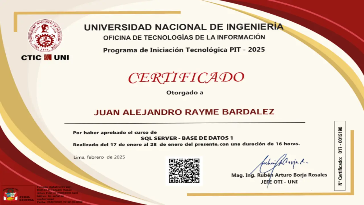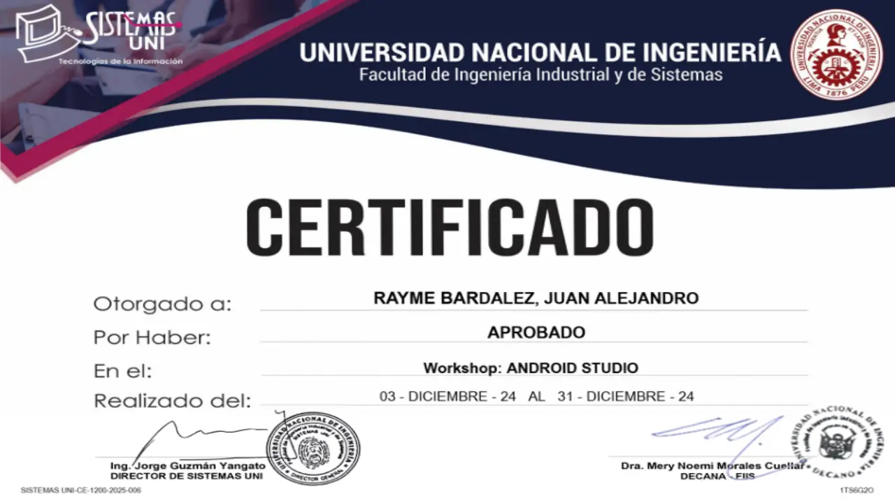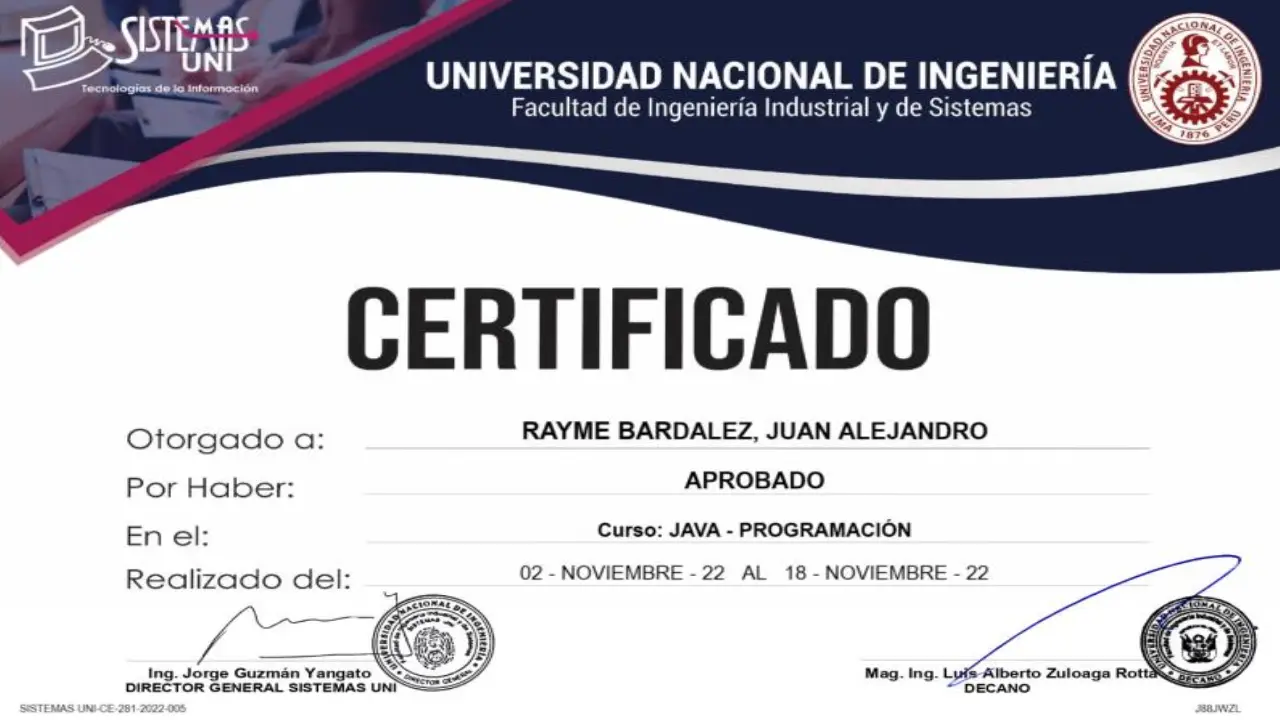 Soy Juan Rayme Bardalez, estudiante de Ingeniería de Software con especialización en Inteligencia Artificial. Desde muy joven descubrí mi pasión por la tecnología, y desde entonces he dedicado mis esfuerzos a formarme de manera integral en el mundo del desarrollo de software, el análisis de datos y la creación de soluciones digitales innovadoras. A lo largo de mi carrera he adquirido experiencia en áreas clave como el desarrollo web, aplicaciones móviles con Android Studio, diseño de bases de datos, automatización de procesos y análisis de requerimientos. Me considero una persona curiosa, autodidacta y comprometida con la mejora continua, lo que me ha llevado a complementar mi formación académica con cursos especializados en instituciones como OpenBootcamp, Cisco Networking Academy y la Universidad Nacional de Ingeniería.